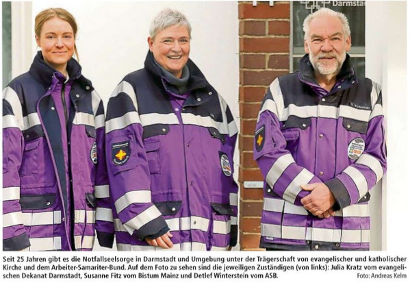 Sie rücken aus, wenn es „Erste Hilfe für die Seele“ braucht: Mit ihren lilafarbenen Jacken ist das Team der Darmstädter Notfallseelsorge bei schweren...