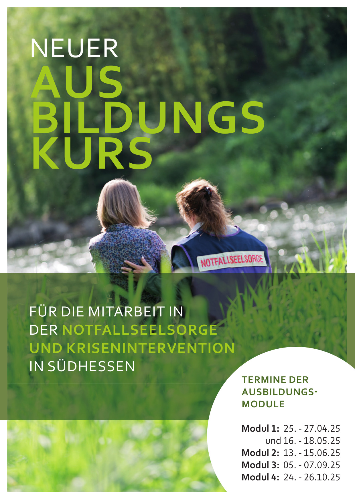 Die Einrichtungen der Notfallseesorge und Krisenintervention in Südhessen - in Darmstadt, an der Bergstraße, im Odenwaldkreis und im Kreis Darmstadt-Dieburg - starten im April 2025 einen Ausbildungskurs für neue ehrenamtlich Mitarbeitende. Der Grundkurs findet an insgesamt 5 Wochenenden bis Oktober 2025 statt. Der Kurs beinhaltet die Qualif[...mehr]